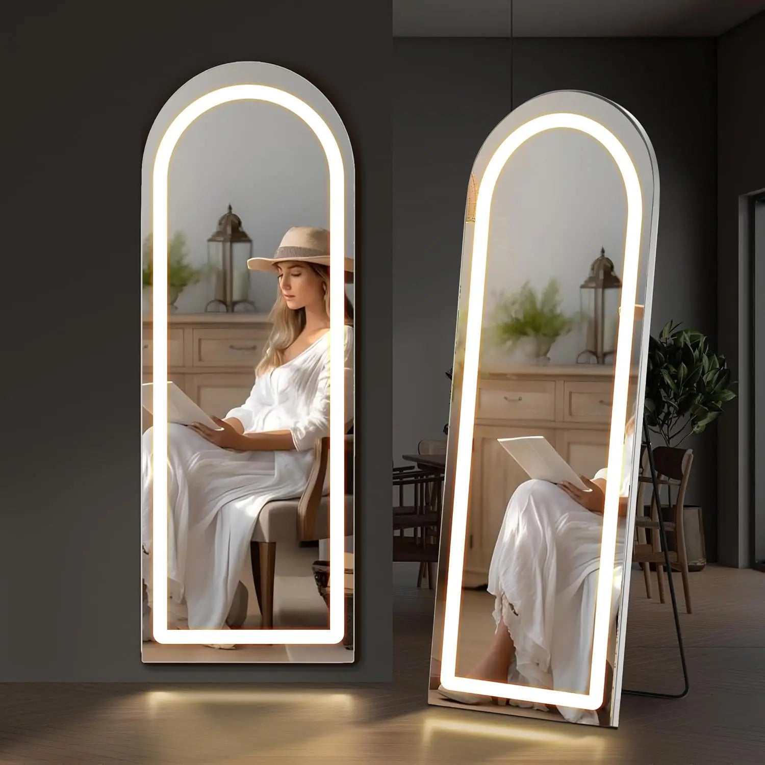- Versatile full-length floor mirror or wall-mount: stand freely, lean against a wall, or mount, all inside an aluminum frame that brightens any room.