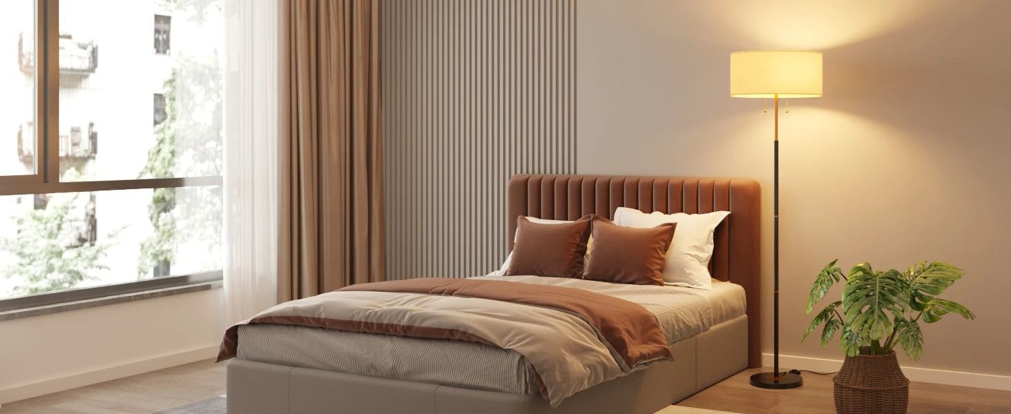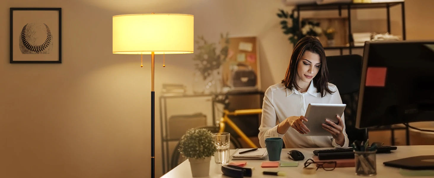Brighten your living space with a mid-century floor lamp that pairs a fabric drum shade with warm, inviting light.
