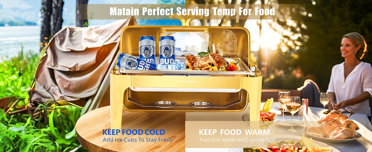 - Hot or cold service: ignite the fuel to maintain warmth for mains and sides, or add ice to the water tray to chill items for a refreshing contrast.